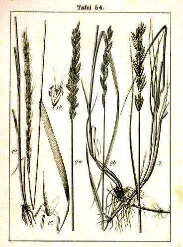 La espiga es larga, y se compone de numerosas espiguillas colocadas a ambos lados de la raspa general, comprimidas y formadas por cuatro, cinco o seis flores cada una. Las glumas ( La gluma es cada una de las dos hojitas escariosas que a modo de brácteas rodean las espiguillas de las gramíneas) son agudas o terminadas en una arista, y un poco más cortas que la espiguilla; la glumilla inferior también es aguda, y remata asimismo en una breve arista, que puede acortarse hasta formar una simple puntita apical.