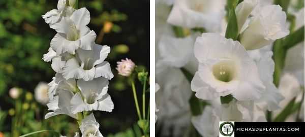 - Gladiolo Alaska: Flores grandes y estambres de color blanco puro de 10 a 12 cm de ancho. En el tallo crecen alrededor de 12 flores y la espiga entre 1 y 1,2 m de altura.